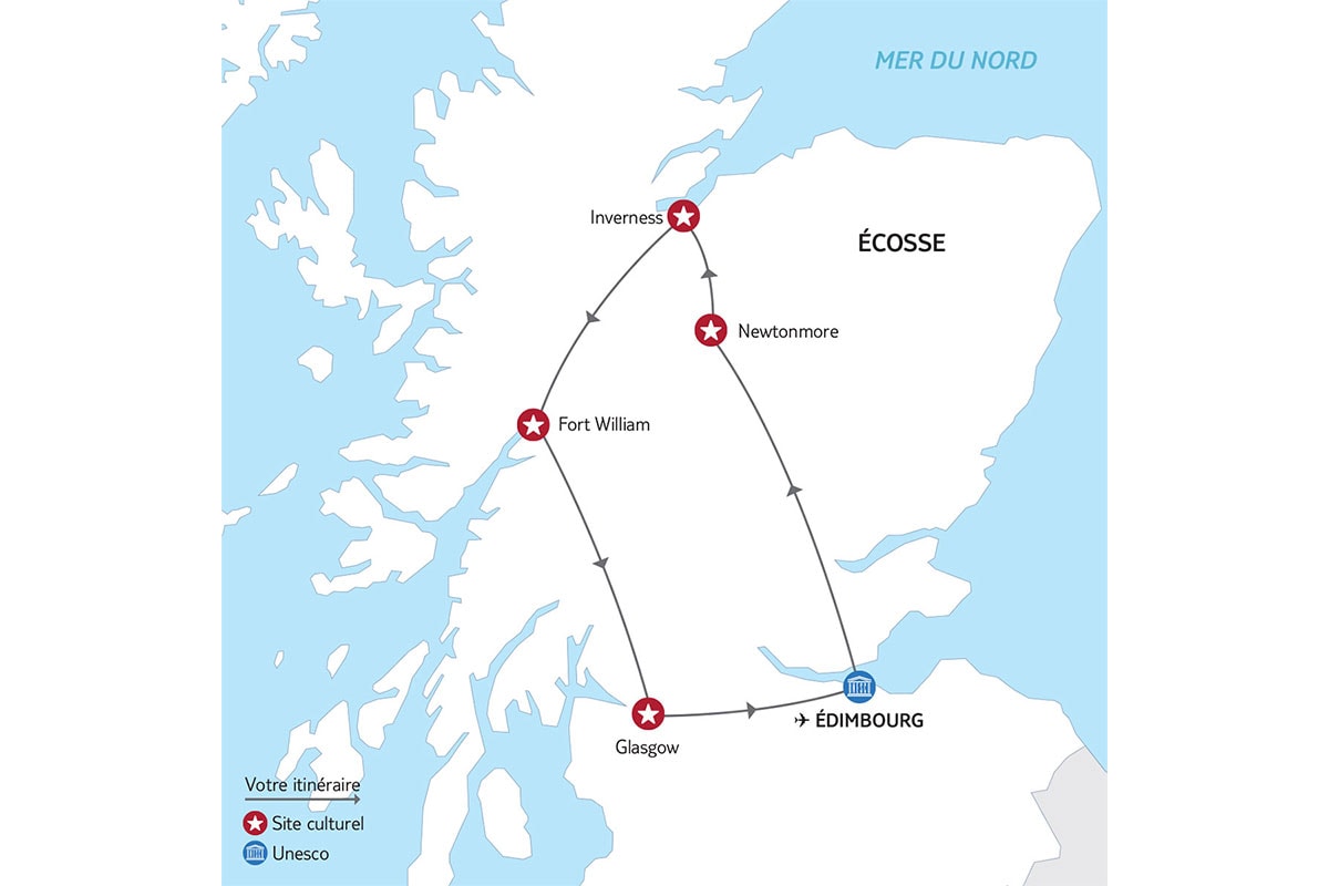 Programme et repas libres jusqu'à la restitution de votre véhicule à l’aéroport d'Édimbourg. Envol pour la France.